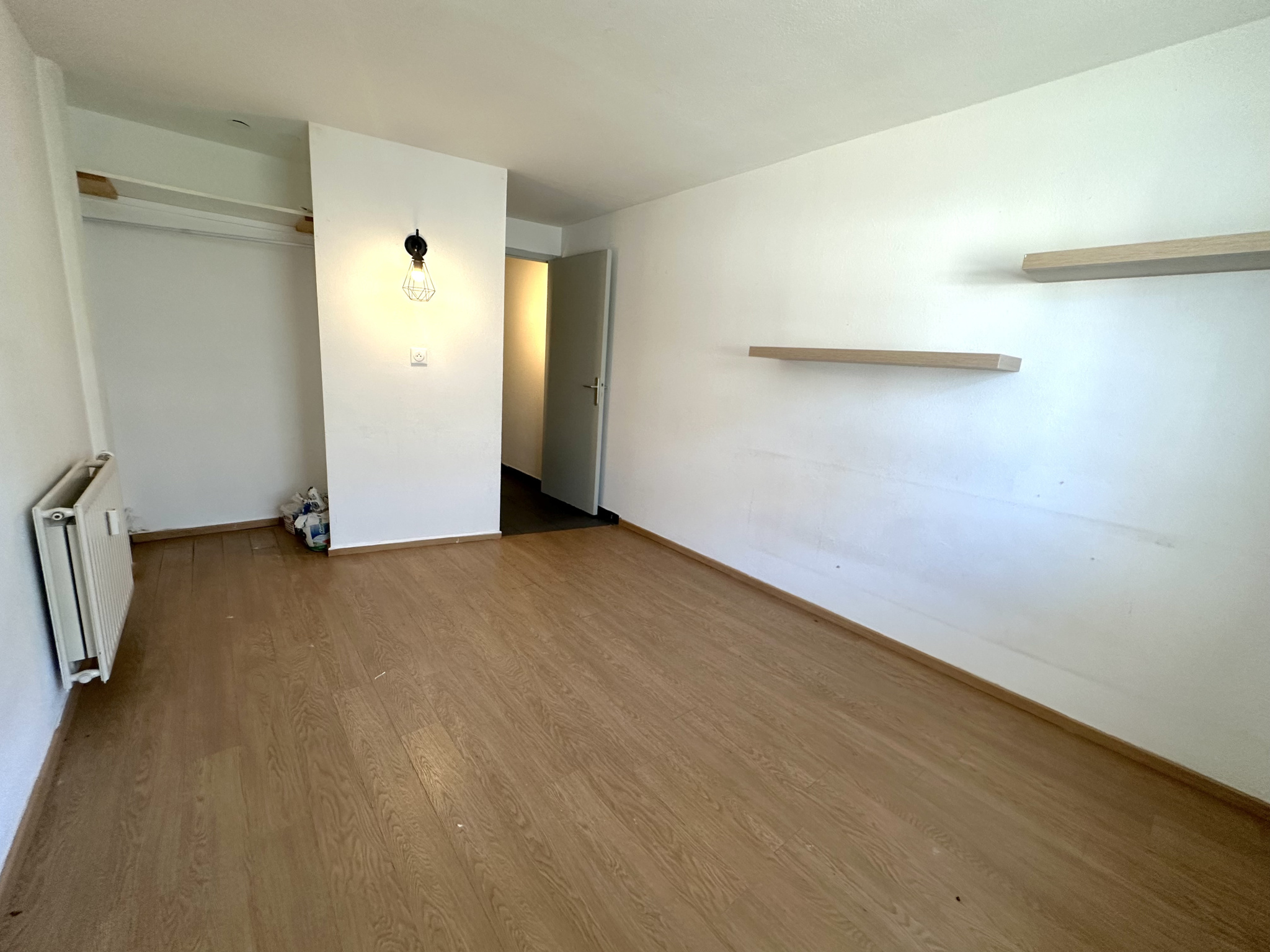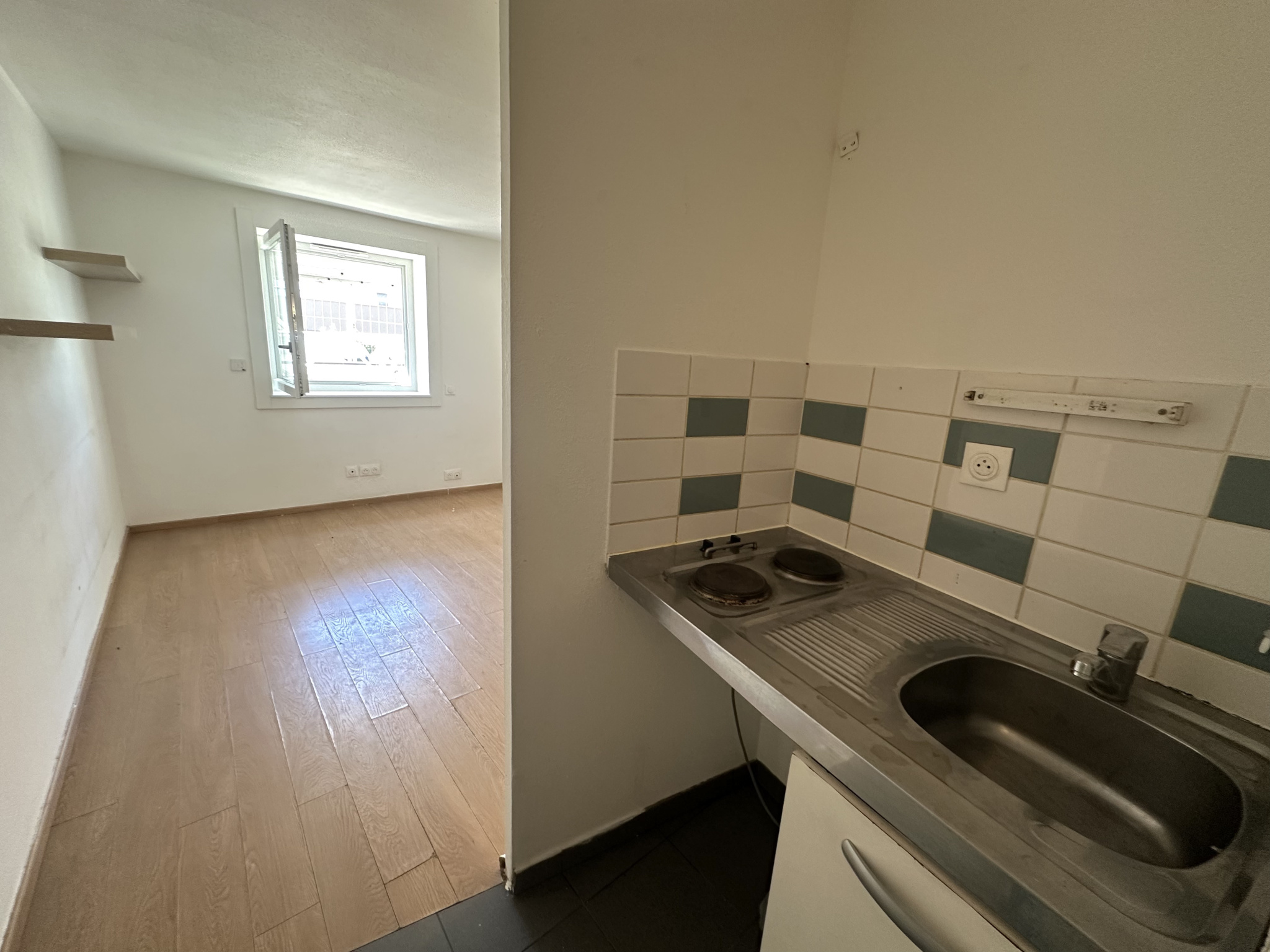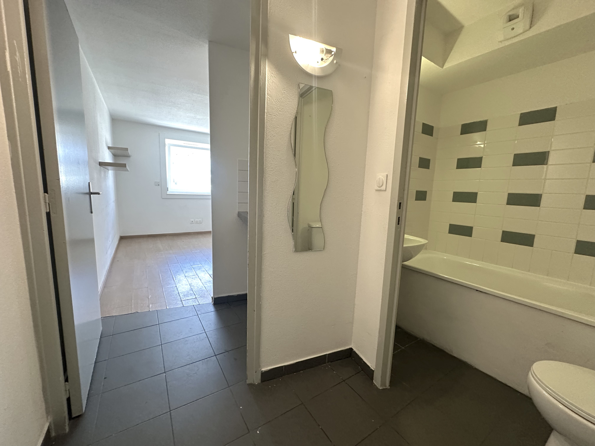 L'appartement est composé d'une entrée, d'une pièce de vie exposée Sud-Ouest, d'un dégagement avec kitchenette et d'une salle de bains avec toilettes.