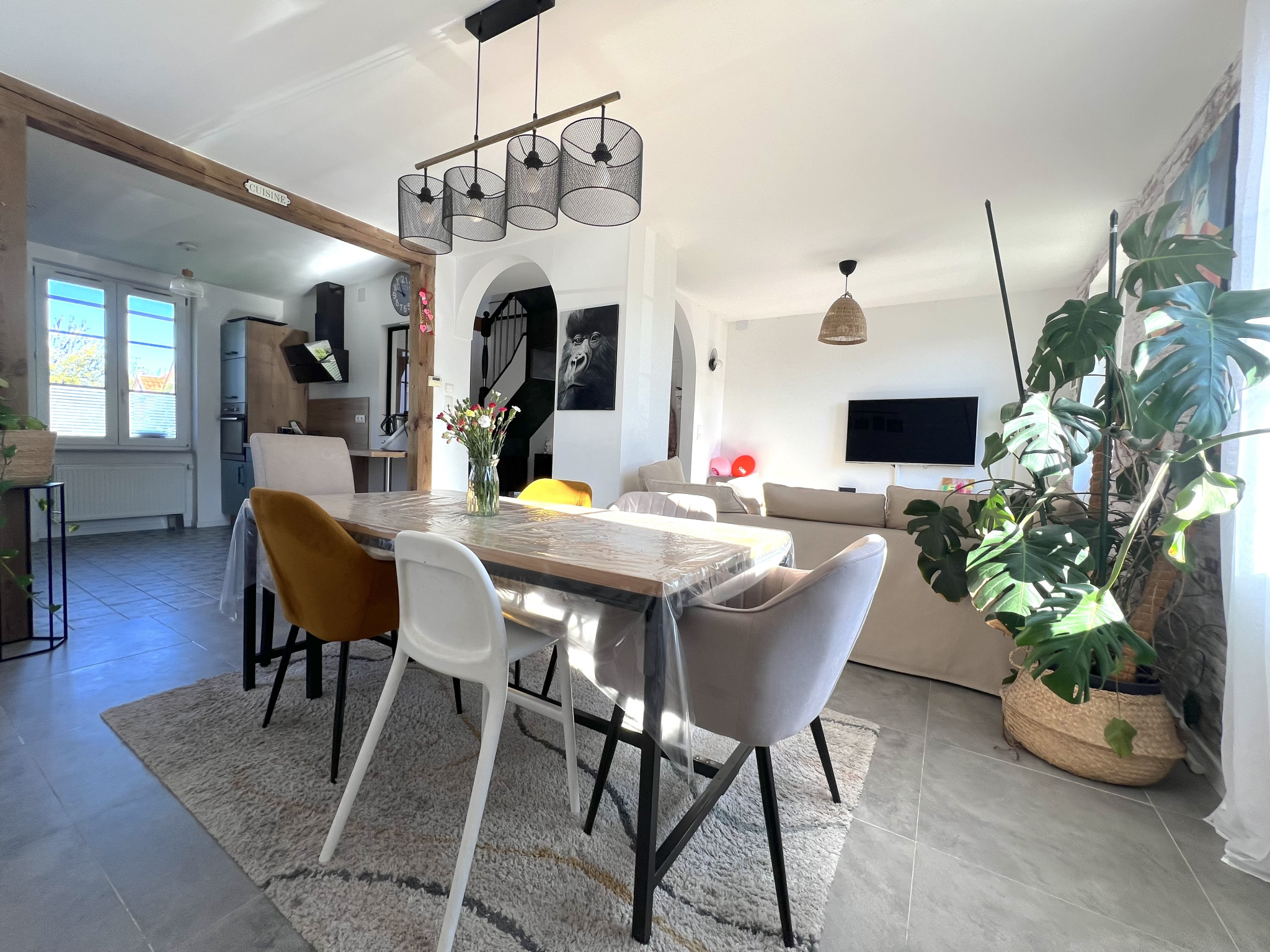 Au rez-de-chaussée : Dégagement entrée, cuisine tout équipée ouverte sur salon-séjour lumineux, un WC.