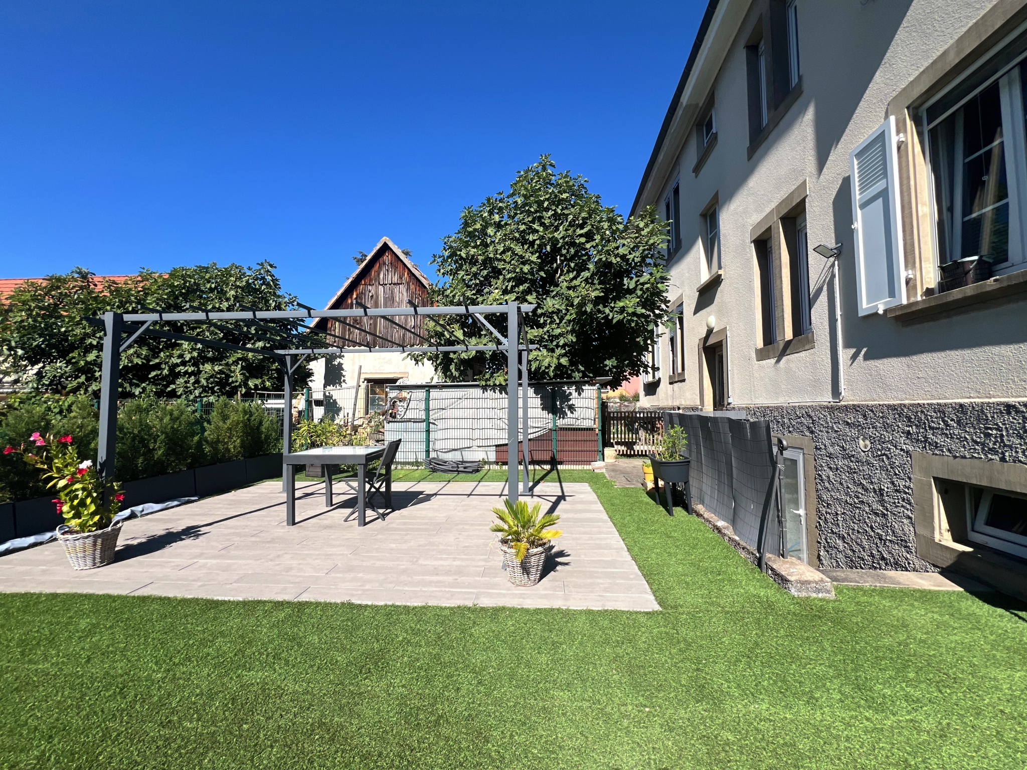 À l’extérieur : sur la partie avant, une cour (2 places de parking confortables), sur la partie arrière un jardin aménagé avec pergola (lumière + point d’eau)