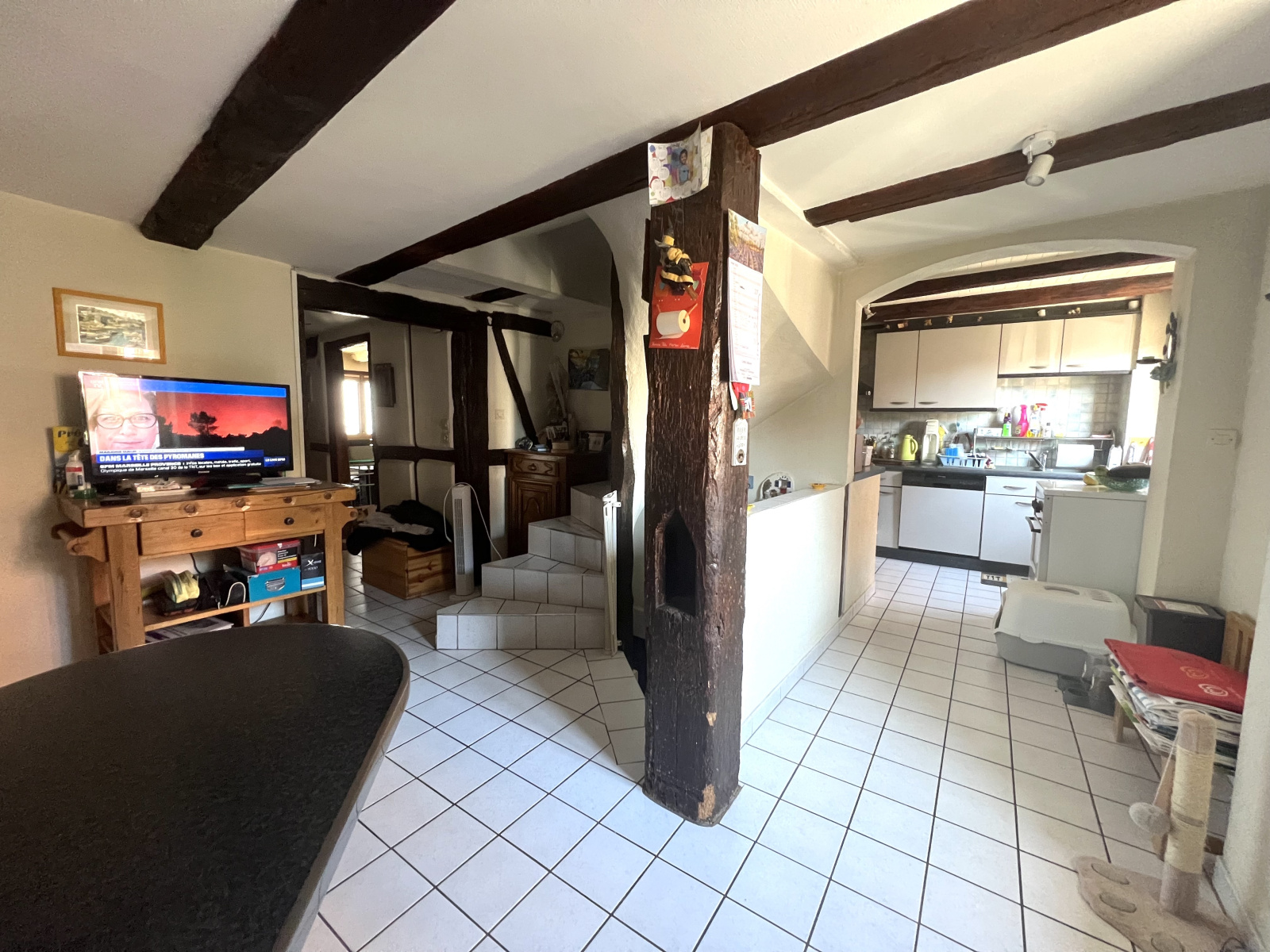 Dégagement entrée, grande pièce de vie, cuisine tout équipée avec espace repas, un bureau.