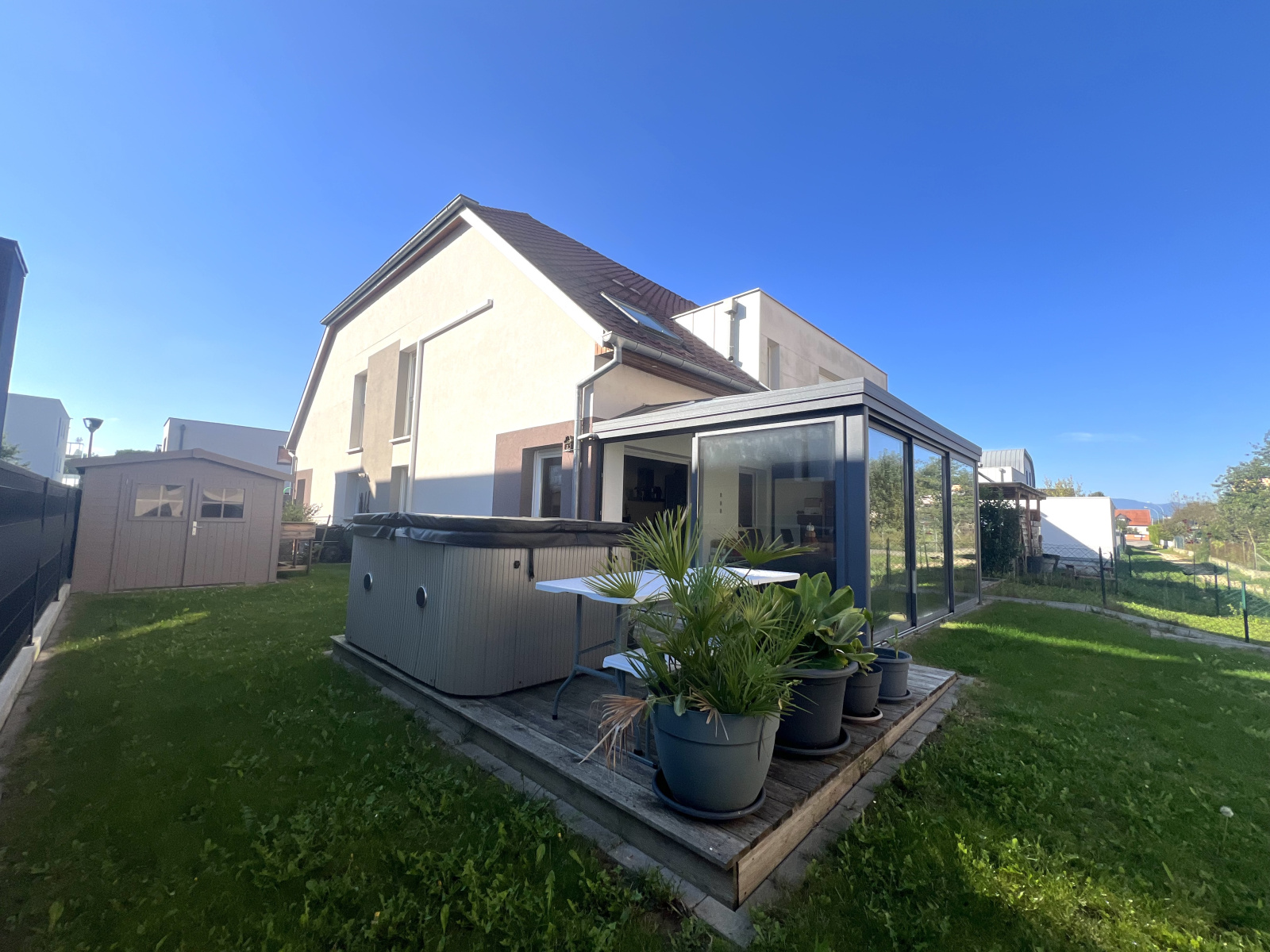 À l’extérieur : beau jardin avec terrasse agrémenté d’un jacuzzi et d’un abri de jardin.